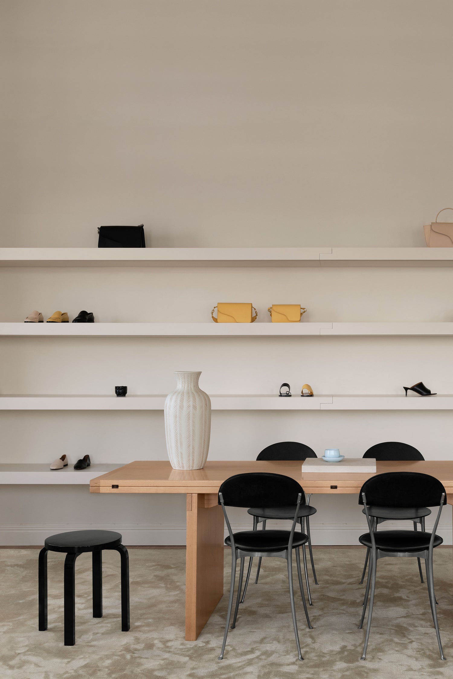 In partnership with architecture Studio Escapist, Maj-La designed the space and carefully curated the interior to fit the personal and warm, but still sleek and minimal expression of the brand. Mixing Scandinavian and Italian iconic designs, most of it vintage from the 70’s and 80’s, bought from auction houses like Bukowskis.